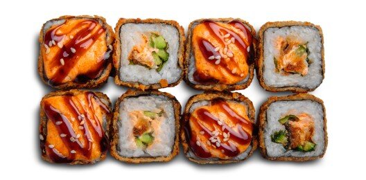 (Слабо-острый)Рис, нори, острый сыр, огурцы, угорь, такуан, лосось, кляр