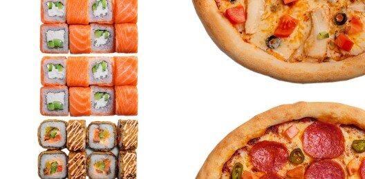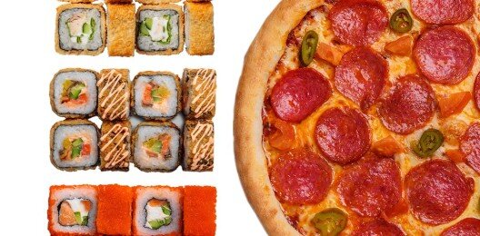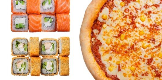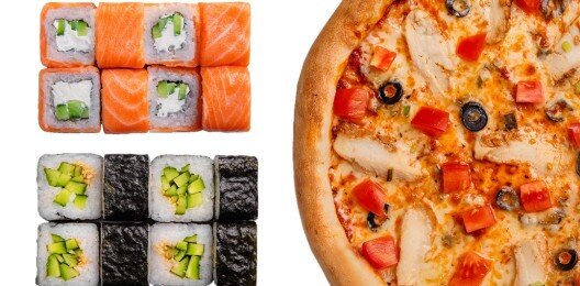 " Филадельфия классическая (1 порция), ролл с угрем и огурцом (1 порция), ролл канада (1 порция), цезарь соус (1 порция), пицца салями (30 см) , пицца маргарита (30 см)"
