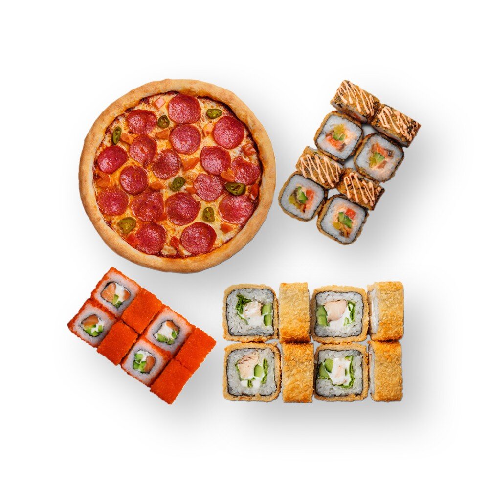 Калифорния с лососем 1 порция ролл. Ролл Цезарь 1 порция. Ролл Темпура жаренный 1 порция. Чесночный соус 1 порция. Пицца Пепперони 30 см на фирменном тесте.