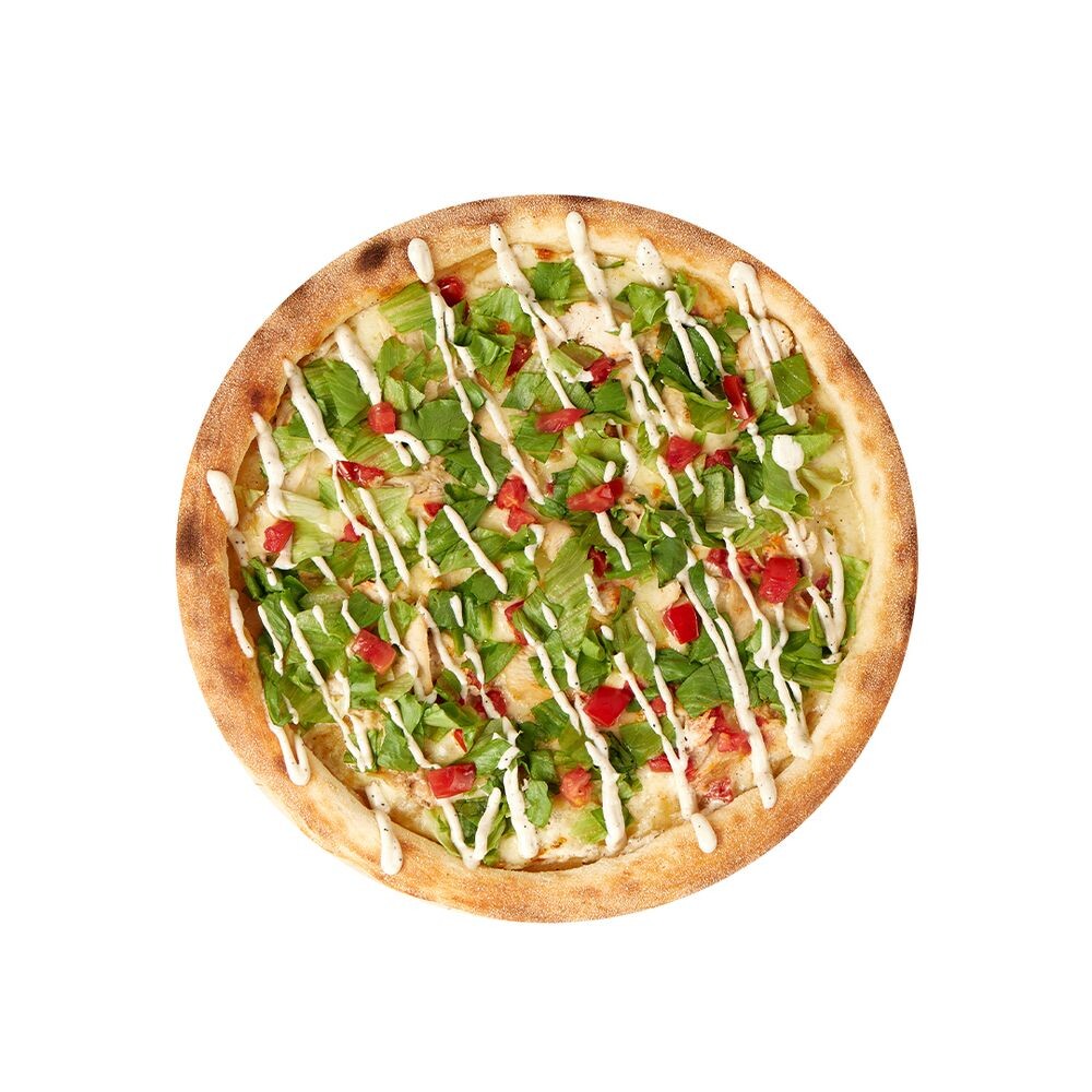 Белый соус для пиццы, сыр моцарелла, курица, помидоры, салат айсберг