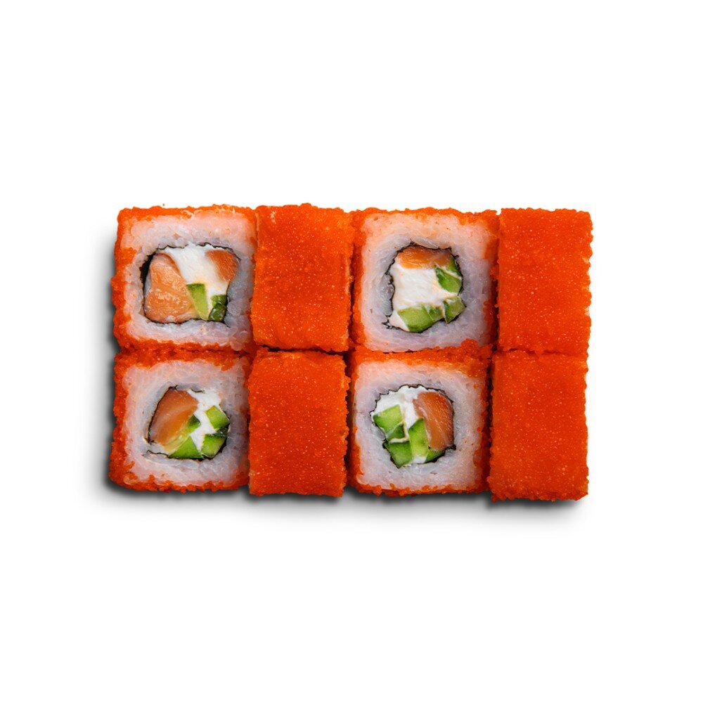 Рис, нори, творожный сыр, огурцы, лосось, икра тобика